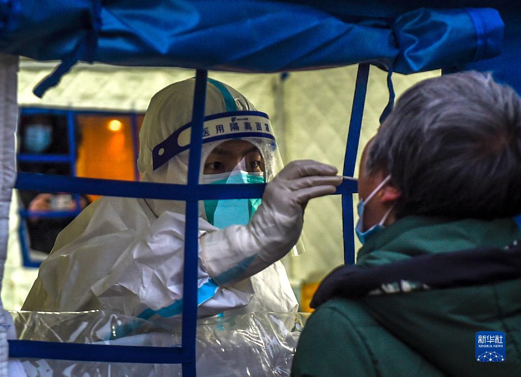 3月4日清晨,在呼和浩特市回民區攸攸板鎮賽馬場北路社區某核酸采樣點,工作人員為群眾做核酸采樣。