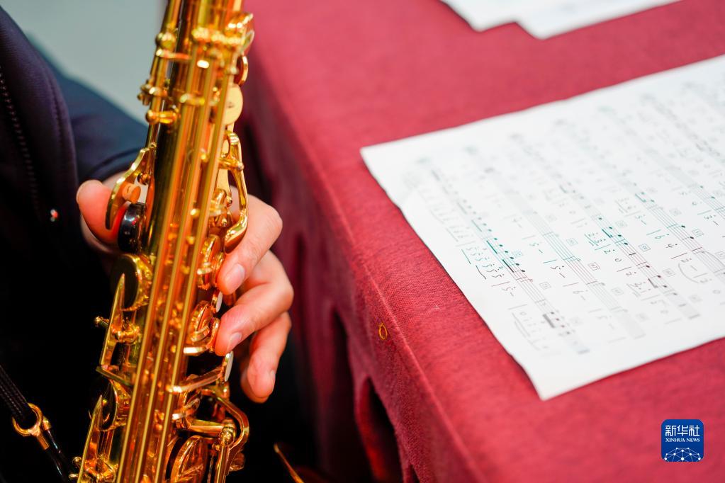 圖為在重慶市特殊教育中心的一間辦公室內(nèi),揚(yáng)帆管樂團(tuán)老師周建勛對照國際殘奧委會會歌《未來贊美詩》用薩克斯進(jìn)行練習(xí)(1月12日)。