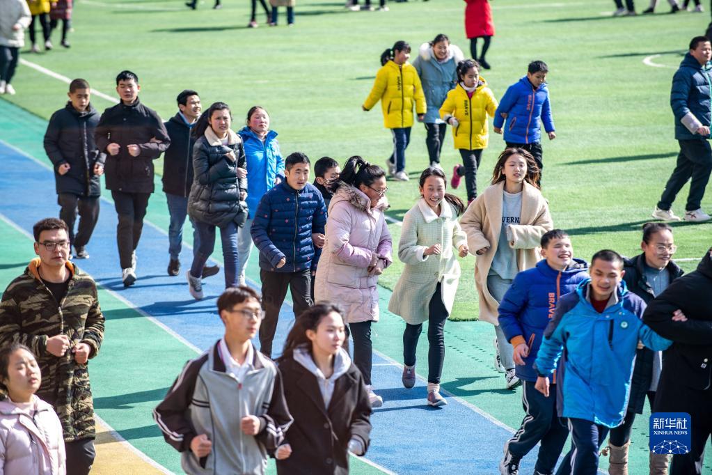圖為重慶市特殊教育中心視障學(xué)生在學(xué)校操場(chǎng)跑步(2月23日攝)。