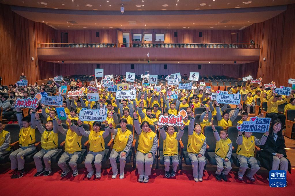 圖為在重慶市特殊教育中心,孩子們在揚帆音樂廳集中收看北京冬殘奧會開幕式時,為即將登場演奏的揚帆管樂團參演團隊加油(3月4日攝)。