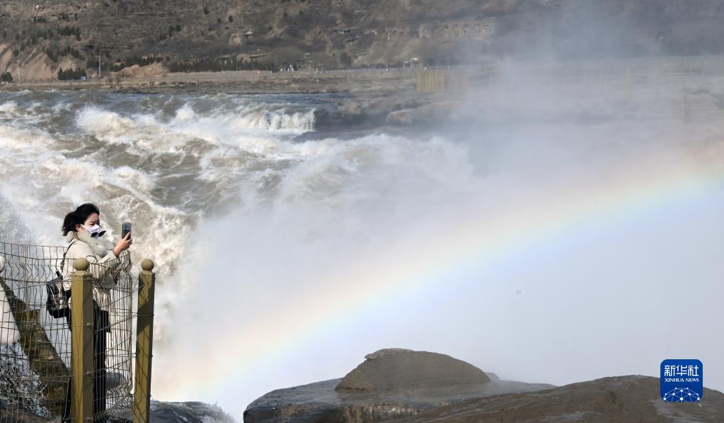 隨著氣溫不斷回升,黃河壺口瀑布水流量明顯增大,在陽光的照射下,飛瀑與彩虹相映成趣,把一幅動靜結合的春天畫卷展現在游客眼前。