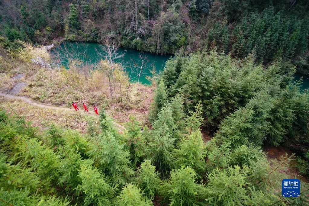 3月9日,護林員在貴州省黔東南苗族侗族自治州臺江縣南宮鎮的林區巡護(無人機照片)。