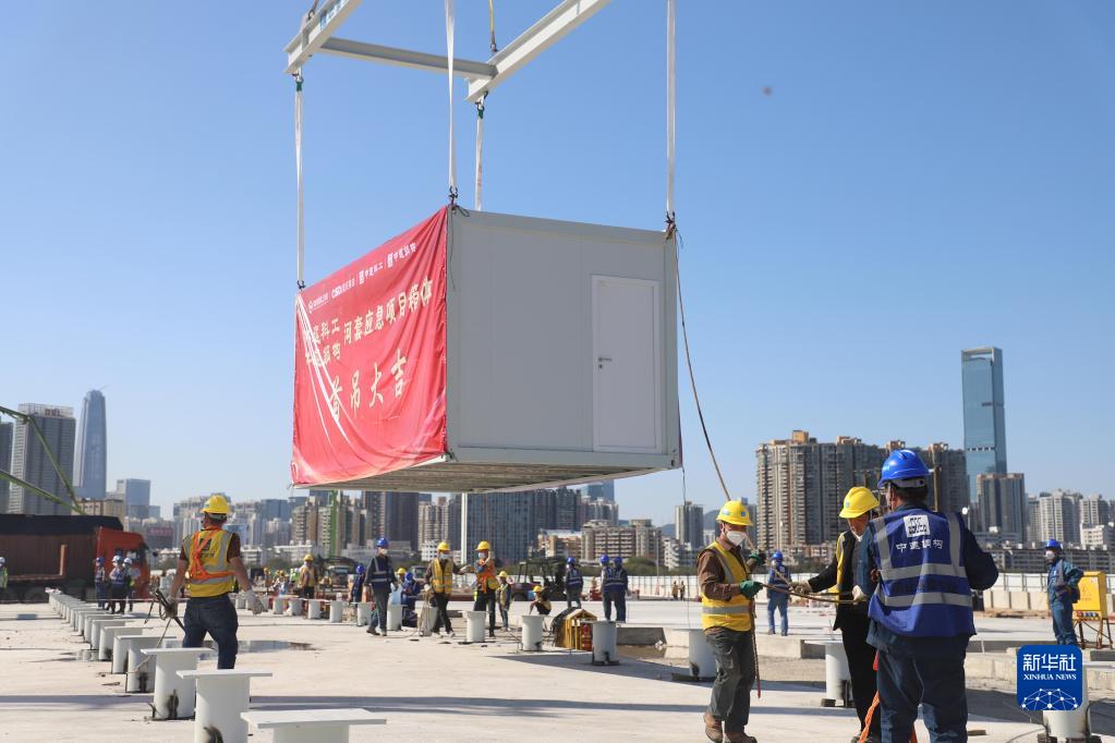 3月9日,中央援建香港應急醫(yī)院項目首個集成式箱體吊裝施工現(xiàn)場。