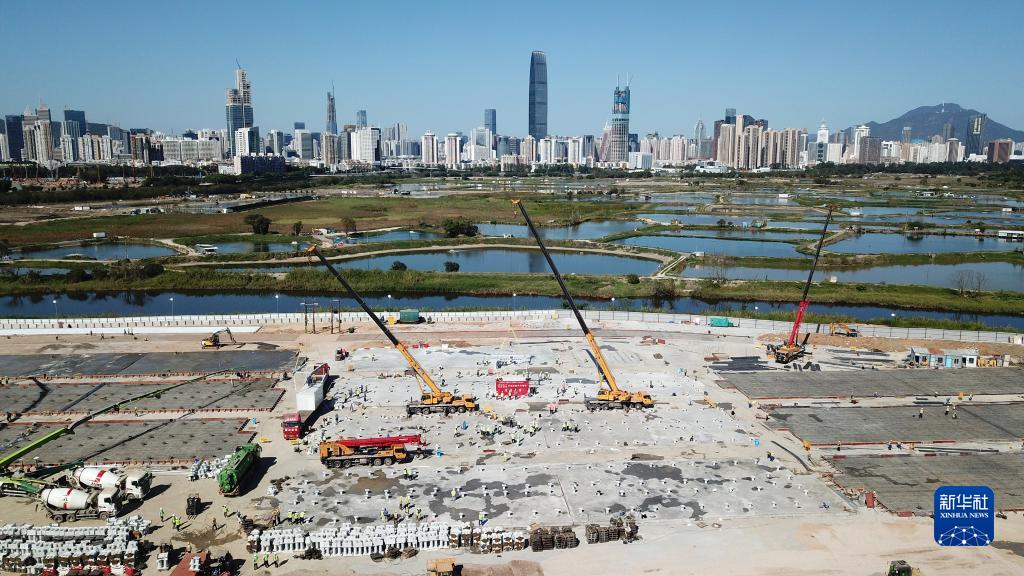 這是3月9日拍攝的中央援建香港應(yīng)急醫(yī)院項目首個集成式箱體吊裝施工現(xiàn)場(無人機(jī)照片)。