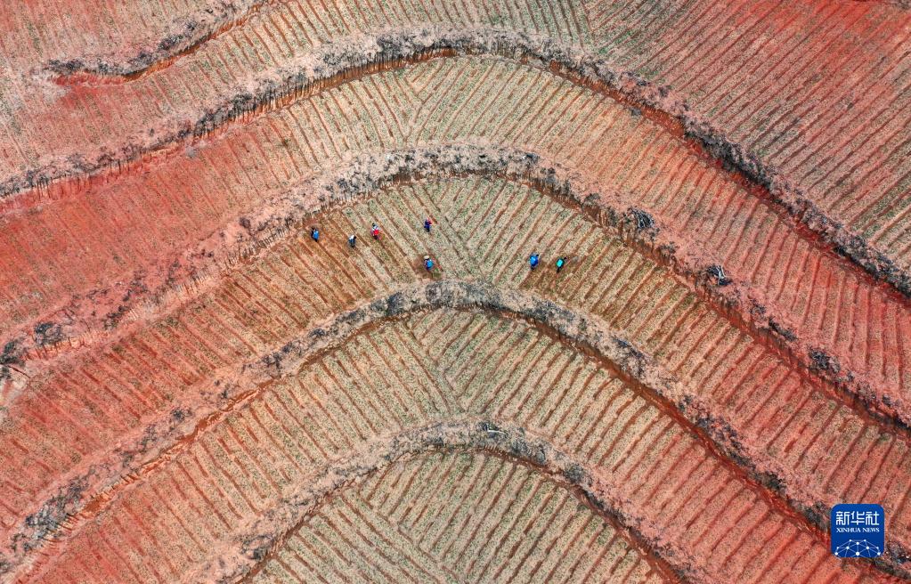 3月9日,村民在貴州省黔東南苗族侗族自治州丹寨縣興仁鎮擺泥村管護中藥材太子參(無人機照片)。