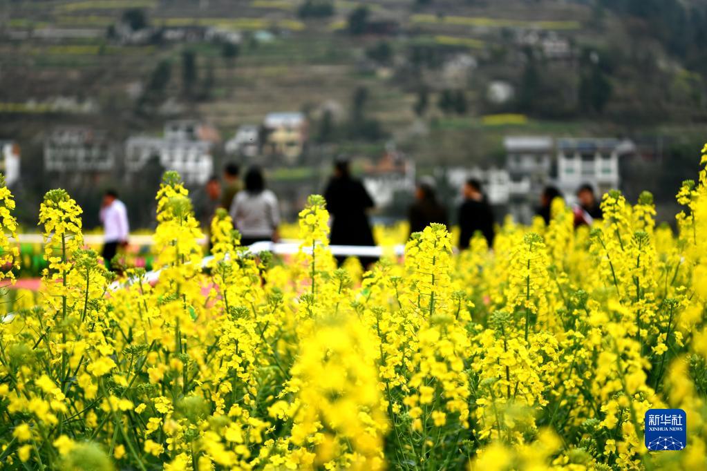 3月10日,人們在貴州省桐梓縣獅溪鎮大興村油菜花田游玩。