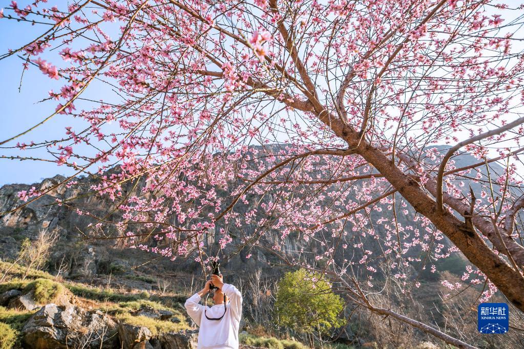 3月10日,攝影愛好者在貴州省威寧彝族回族苗族自治縣海拉鎮花果村拍攝桃花。