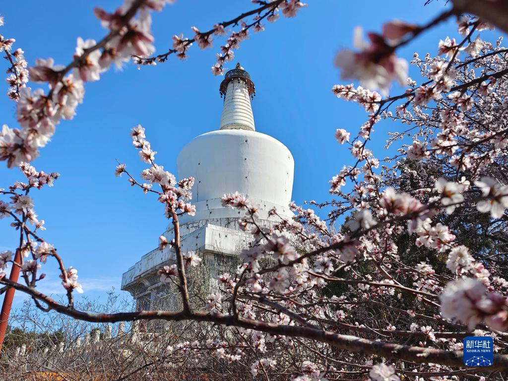 春暖大地,北京北海公園白塔旁的山桃花盛開,吸引不少游客前來欣賞。