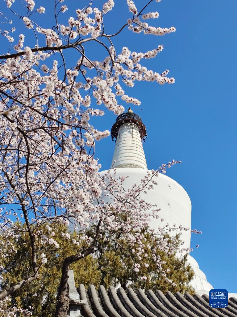 3月14日,盛開的山桃花掩映著北京北海公園白塔。