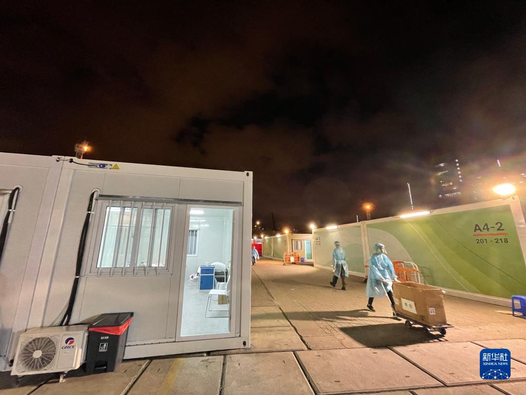 工作人員在夜間向隔離病房運送物資(3月12日攝,手機照片)。