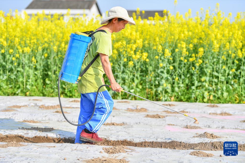 在常德市石門縣葉家坪村,葉金娥在田間噴灑農藥(3月15日攝)。
