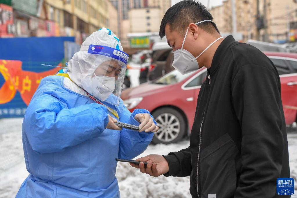 3月18日,吉林市黨員志愿者張騫文(左)在社區核酸檢測采樣點為居民掃碼登記。