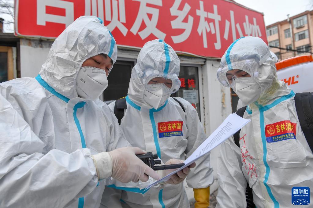 3月18日,吉林市消防救援支隊黨員先鋒突擊隊隊員在進行社區消殺工作安排。
