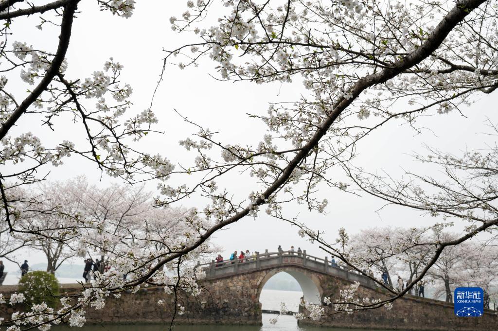 3月19日,游客在江蘇省無錫市太湖黿頭渚景區欣賞盛開的櫻花。