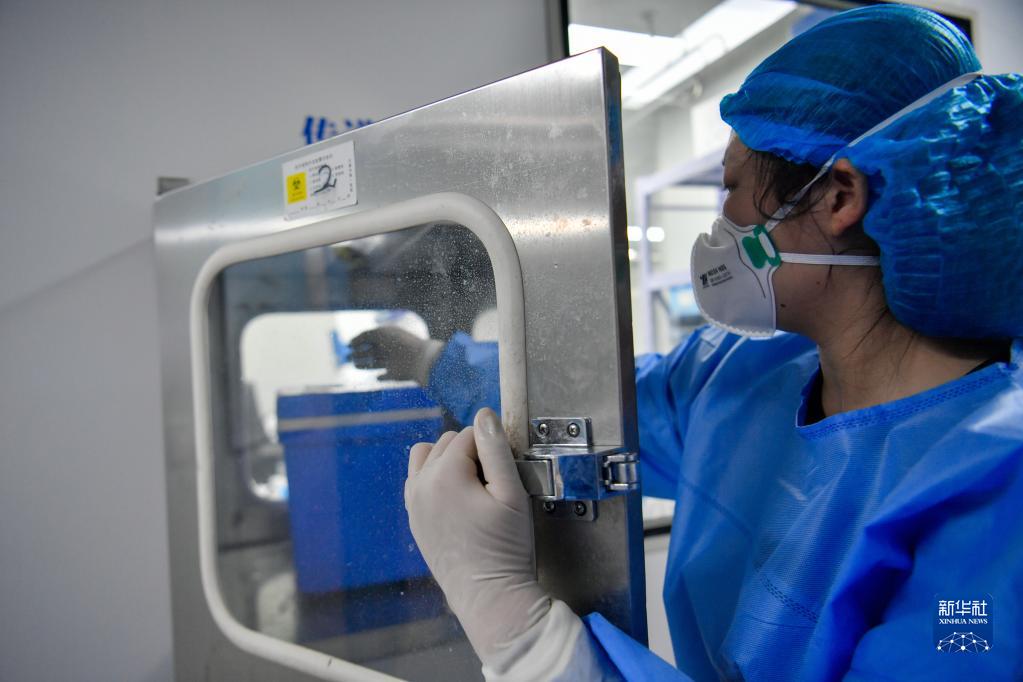 3月19日,在天津市河北區城市核酸檢測基地內,工作人員將樣本箱放入傳遞窗口。