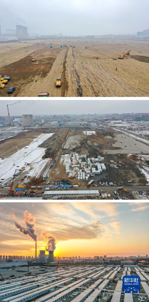 拼版照片:上圖為3月13日拍攝的吉林市高新南區隔離方艙建設現場(無人機照片);中圖為3月15日拍攝的吉林市高新南區隔離方艙建設現場(無人機照片);下圖為3月20日拍攝的吉林市高新南區隔離方艙建設現場(無人機照片)。
