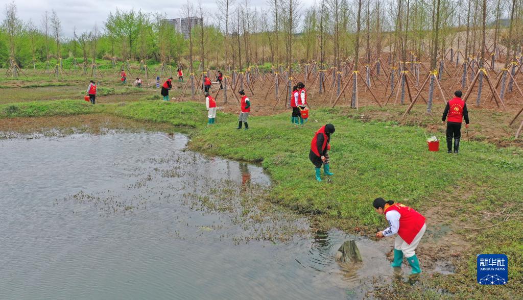 3月21日,浙江省臺州市仙居縣中心幼兒園黨員志愿者在永安溪濕地公園拾撿雜物垃圾、打撈河面漂浮物(無人機照片)。