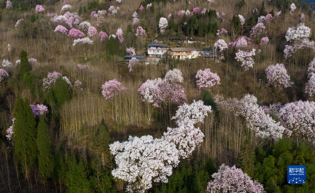3月23日拍攝的江油市大康鎮(zhèn)戴天山村的辛夷花和民居(無(wú)人機(jī)照片)。