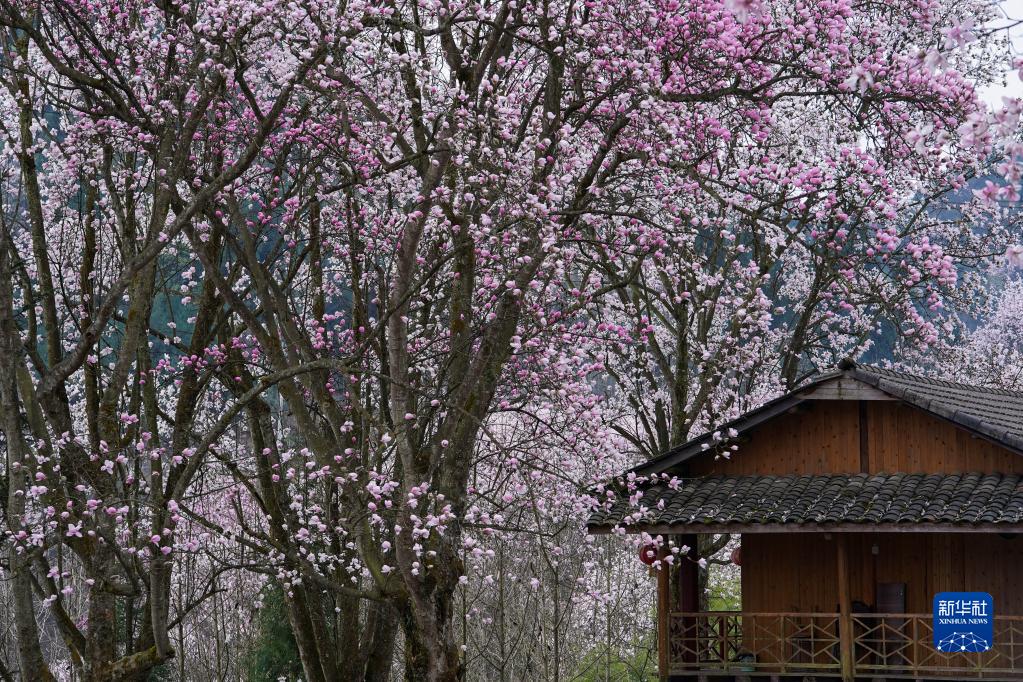 目前正是四川省江油市大康鎮戴天山村的辛夷花盛開的季節。這里的辛夷花在群山環抱中綿延數十里,呈現出一派世外桃源的景象,吸引游人前來踏青賞花。當地的農家樂旅游接待、土特產銷售等“花經濟”,促進了村民們增產增收。
