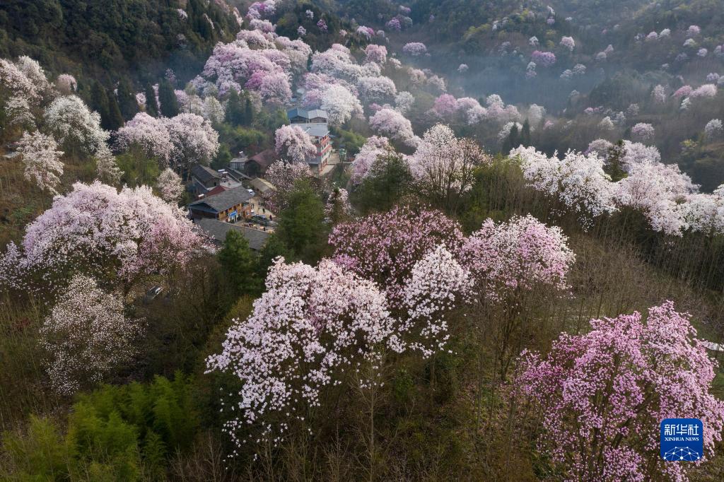 3月23日拍攝的江油市大康鎮(zhèn)戴天山村的辛夷花和民居(無人機(jī)照片)。