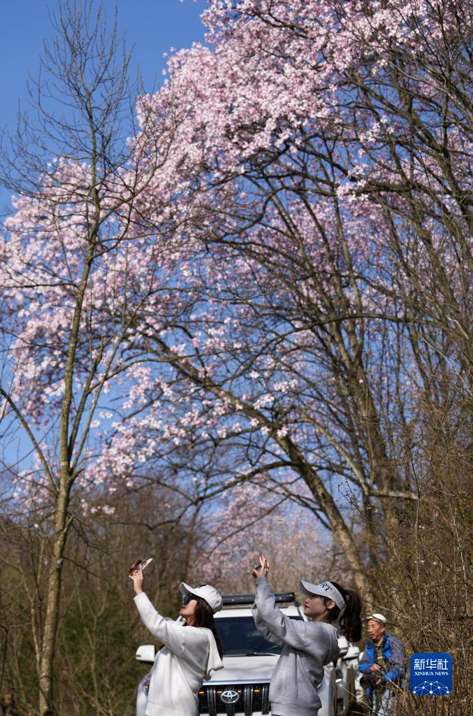 江油市大康鎮戴天山村辛夷花盛開,游人在花林間拍攝(3月23日攝)。