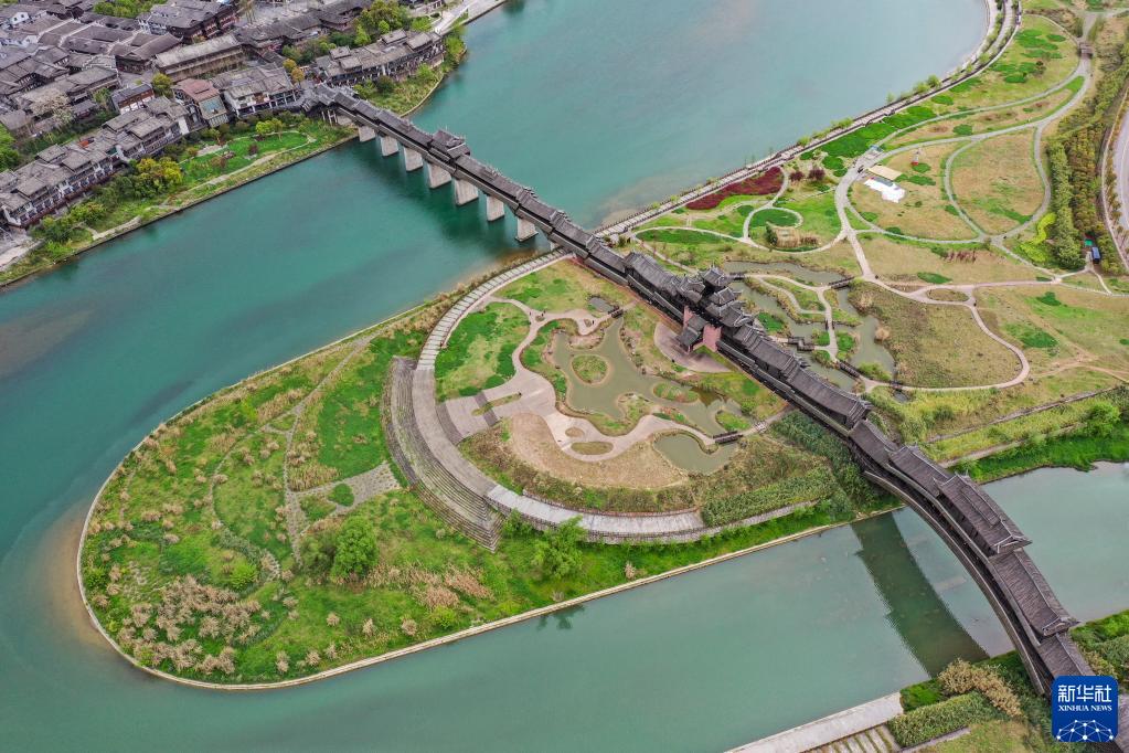 這是3月22日拍攝的重慶市黔江區濯水古鎮景區內的風雨廊橋(無人機照片)。