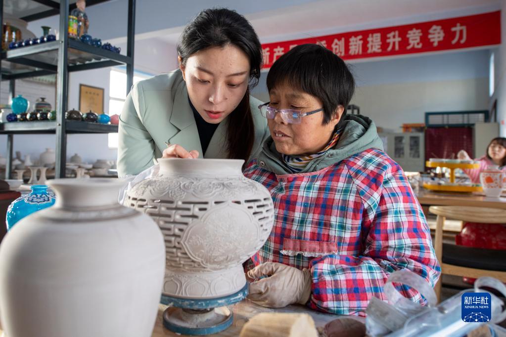 3月23日,在山西省陽城縣沙坡村,喬琳(左)和工作人員交流琺華制作技巧。新華社記者 楊晨光 攝