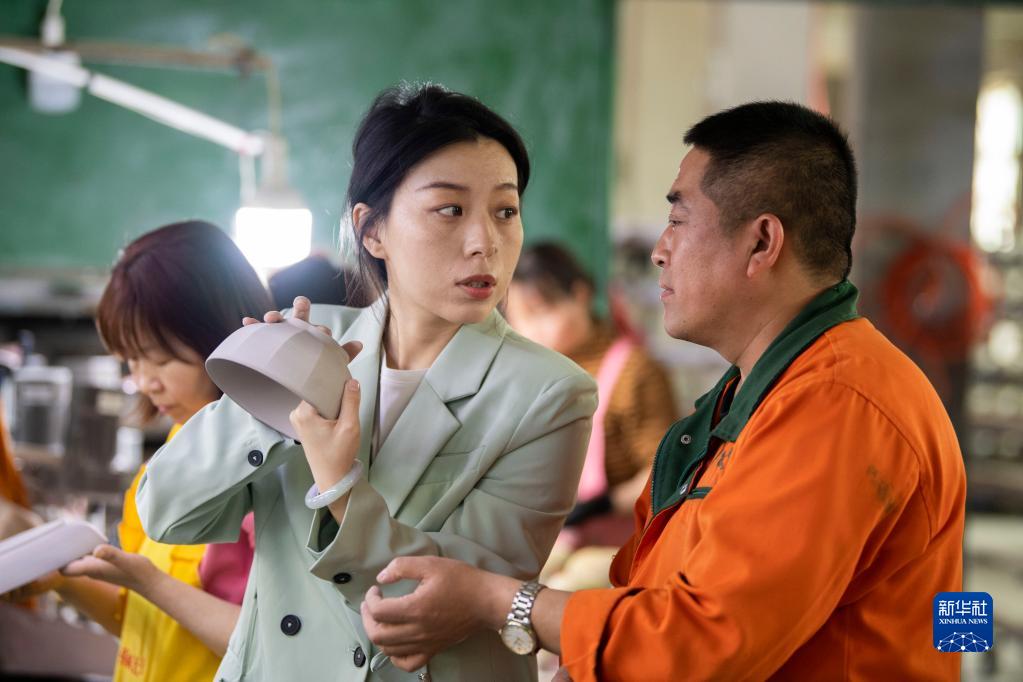 3月24日,在山西省陽城縣沙坡村,喬琳(右二)在喬氏琺華日用瓷器生產車間內向工人了解產品生產情況。新華社記者 楊晨光 攝