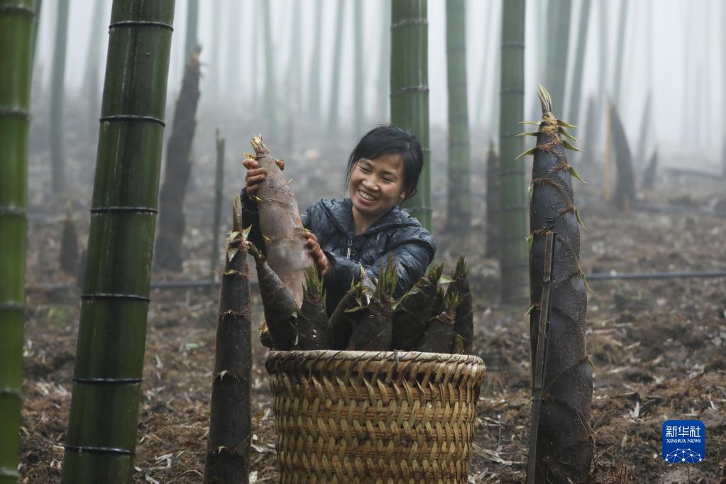 3月26日,貴州省赤水市寶源鄉(xiāng)回龍村村民將采挖的竹筍裝筐。