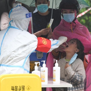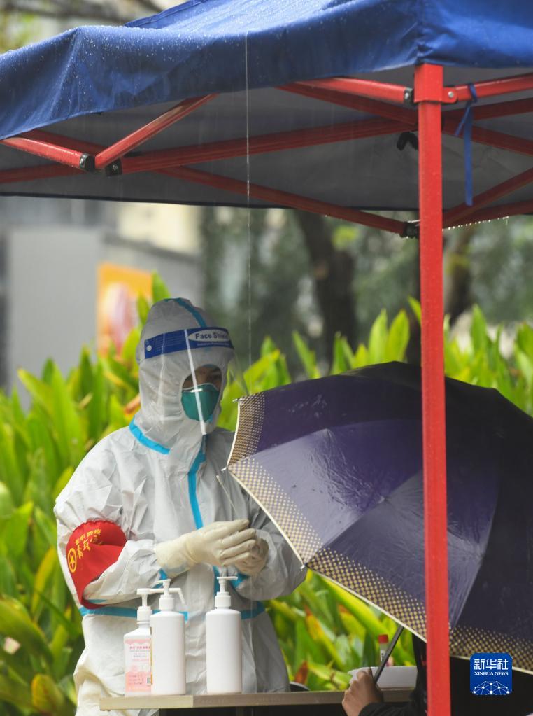 4月1日,在??谑旋埲A區金貿街道國貿社區新冠肺炎核酸采樣點,居民接受核酸采樣。