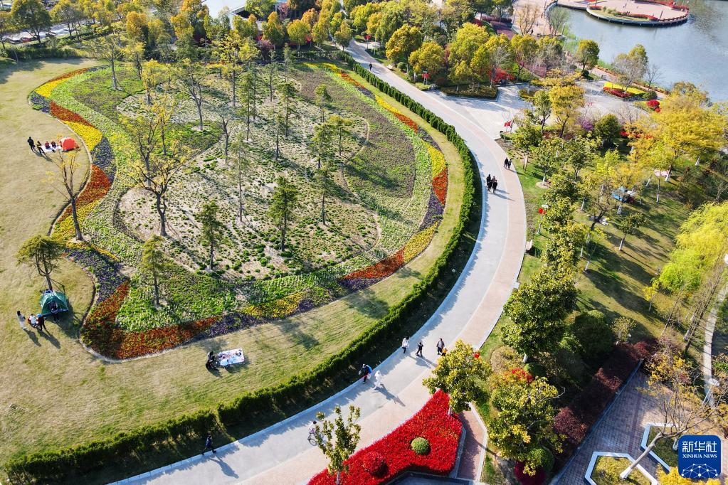 4月4日,市民在江蘇省如皋市龍游河生態公園游玩(無人機照片)。