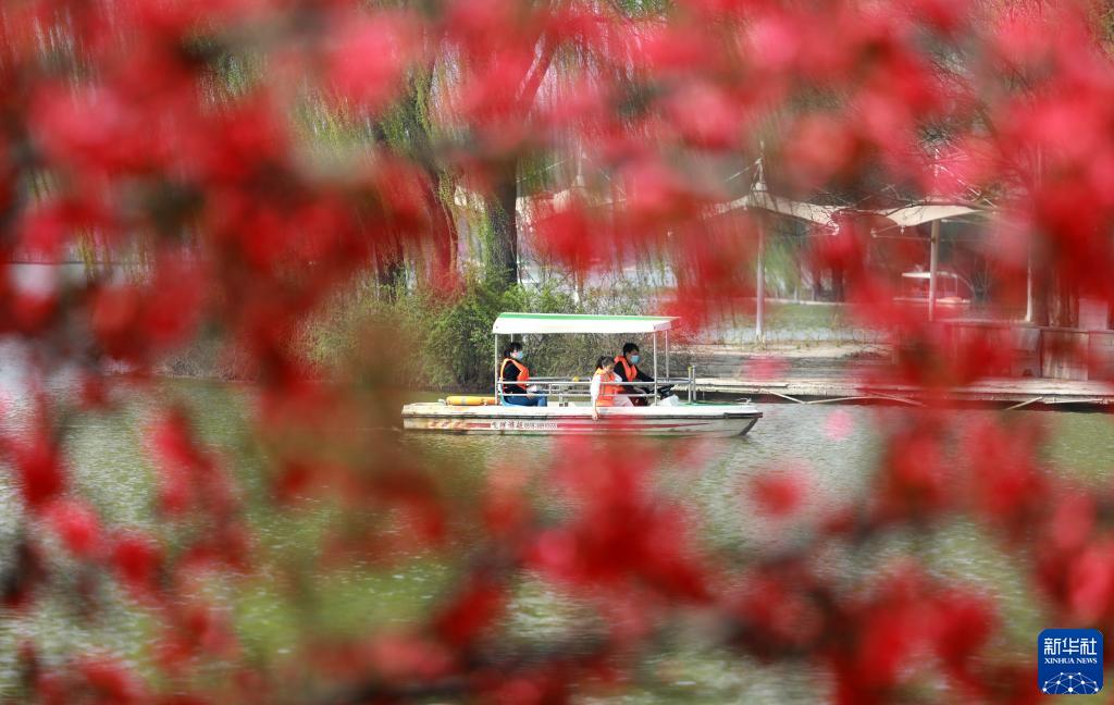 4月4日,游客在河北省石家莊市植物園劃船游玩,享受春光。