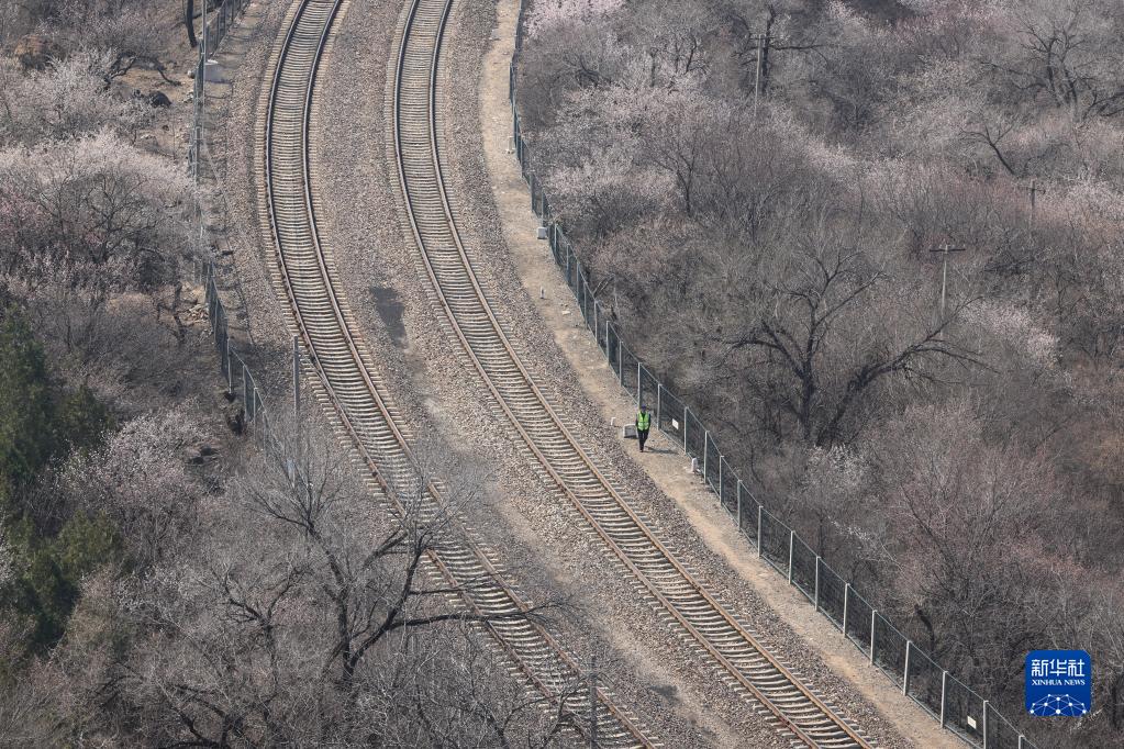 4月4日,北京鐵路公安處南口站派出所的民警在居庸關長城附近線路進行安全隱患排查工作。
