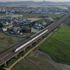 一列動車組列車在廣西南寧市賓陽縣古辣鎮的田野上行駛(4月4日攝,無人機照片)。