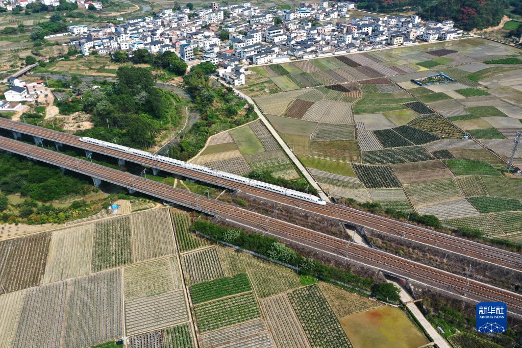 4月6日,一列火車駛過廣西南寧市興寧區(qū)五塘鎮(zhèn)的田園(無人機照片)。