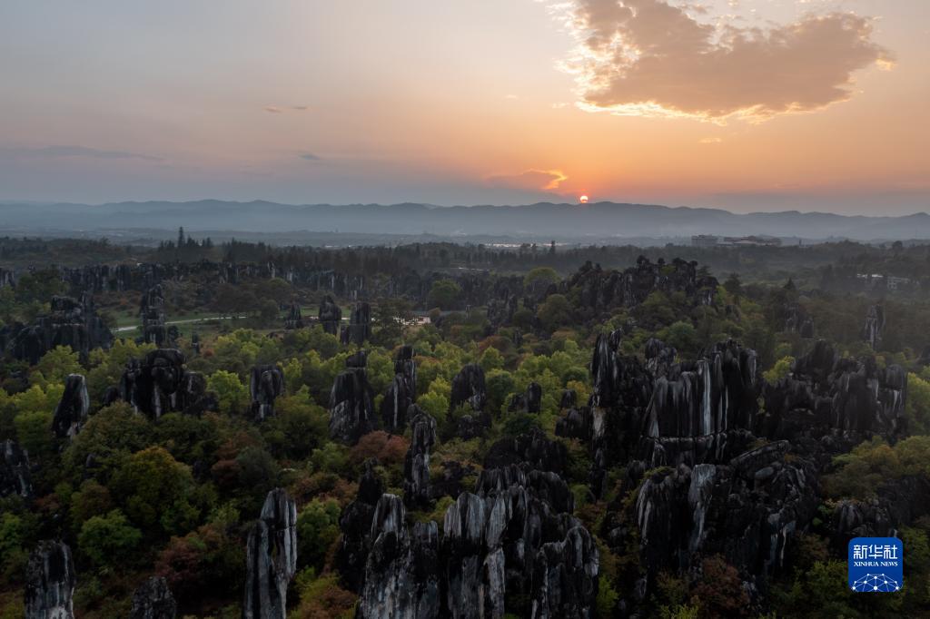 這是4月9日拍攝的石林日落景觀(無人機照片)。