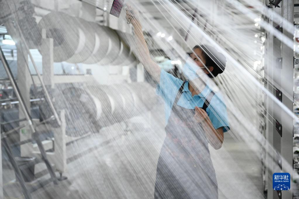 4月12日,在福建泉州石獅市的一家紡織企業,工人在工廠里忙碌。