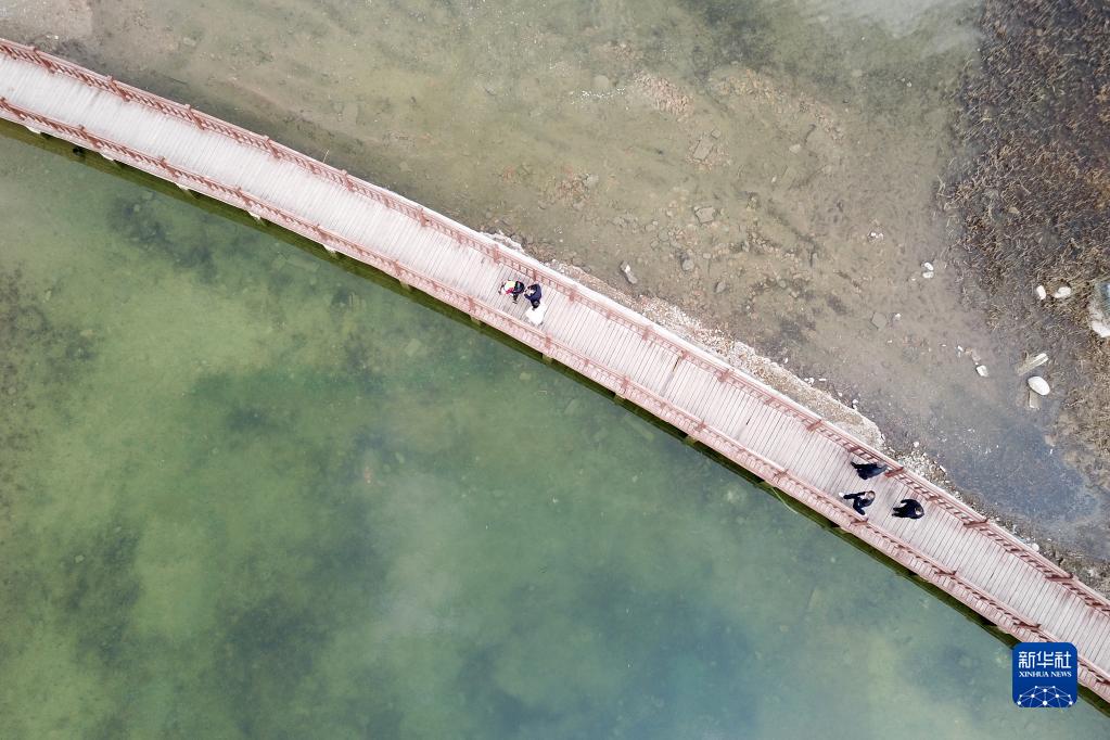 4月24日,在西寧市城西區(qū)白沙灘公園內(nèi),市民在木棧道上散步(無(wú)人機(jī)照片)。
