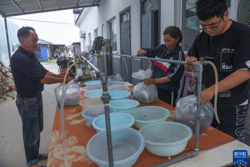 4月27日,在湖州市吳興區東林鎮保健村湖旺水產基地,工作人員打包魚苗準備發售給各養殖戶,一袋魚苗大約有五萬尾。