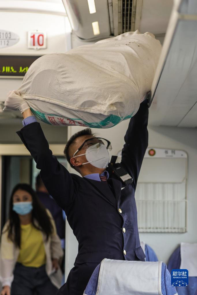 在開往烏魯木齊方向的“和田玉龍號”列車上,列車員為旅客擺放行李(4月28日攝)。