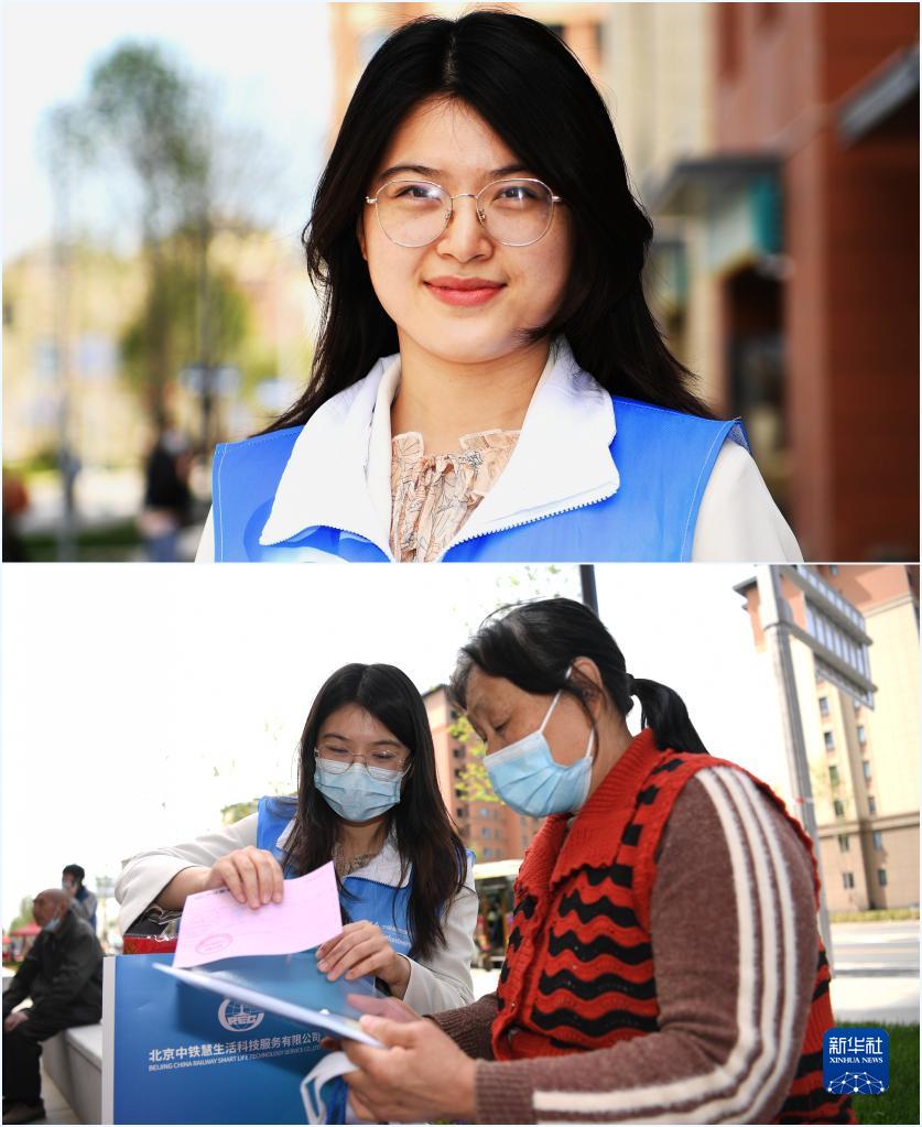 拼版照片:上圖為中國雄安集團城市發(fā)展公司張曉蕊(4月22日攝);下圖為張曉蕊在雄安容東片區(qū)安置房交付現(xiàn)場幫助群眾整理資料(4月22日攝)。