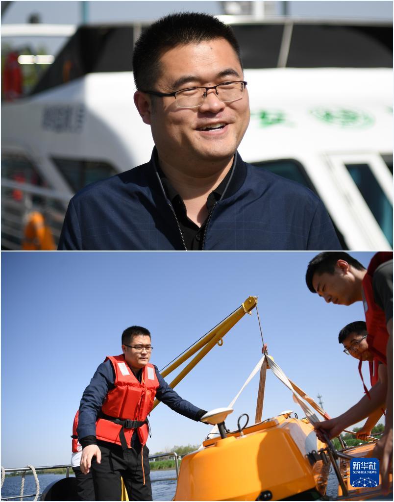 拼版照片:上圖為雄安新區(qū)生態(tài)環(huán)境局生態(tài)環(huán)境監(jiān)測(cè)科負(fù)責(zé)人王英俊(4月26日攝);下圖為王英俊在白洋淀準(zhǔn)備利用無人監(jiān)測(cè)船開展水質(zhì)監(jiān)測(cè)(4月26日攝)。