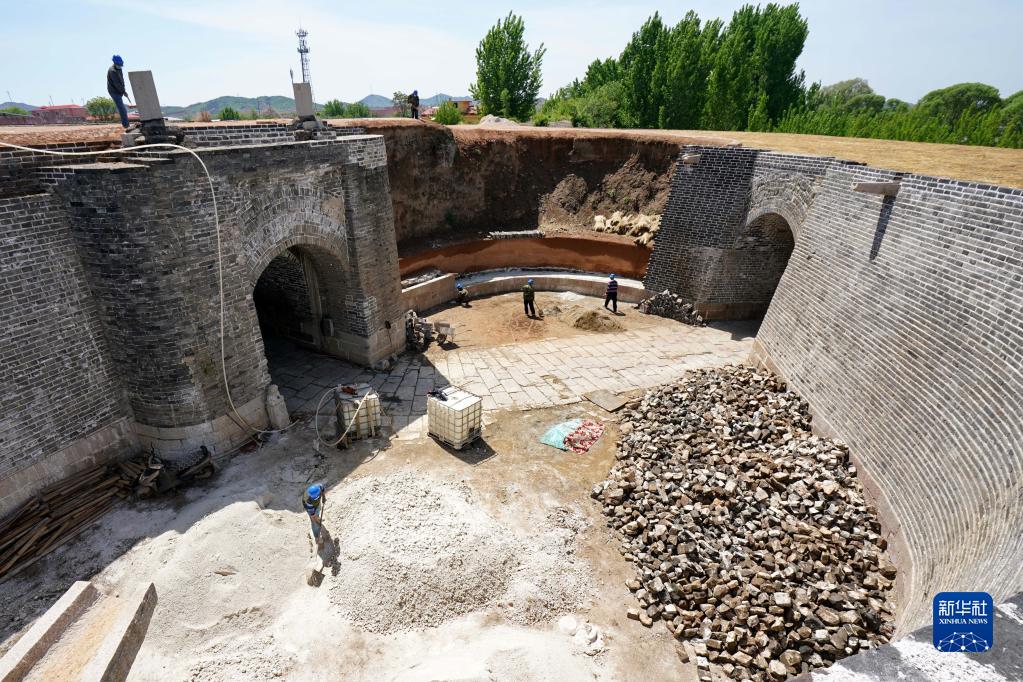 5月7日,工人在秦皇島市盧龍縣城的明代永平府城墻西門甕城修繕工程現(xiàn)場施工。