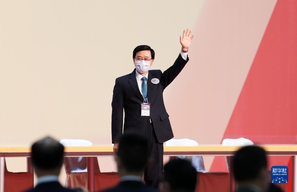 5月8日,在香港會(huì)議展覽中心,李家超揮手致意。