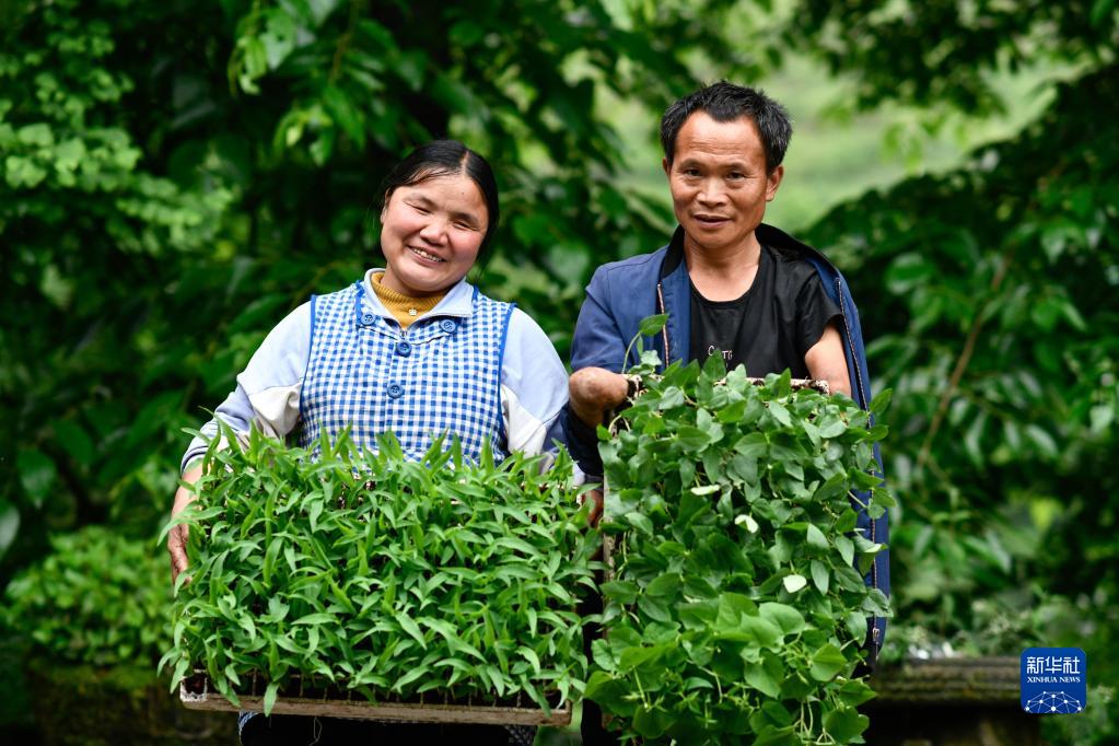 趙友良與妻子簡琴展示他們今年培育的玉米苗和豇豆苗(5月12日攝)。