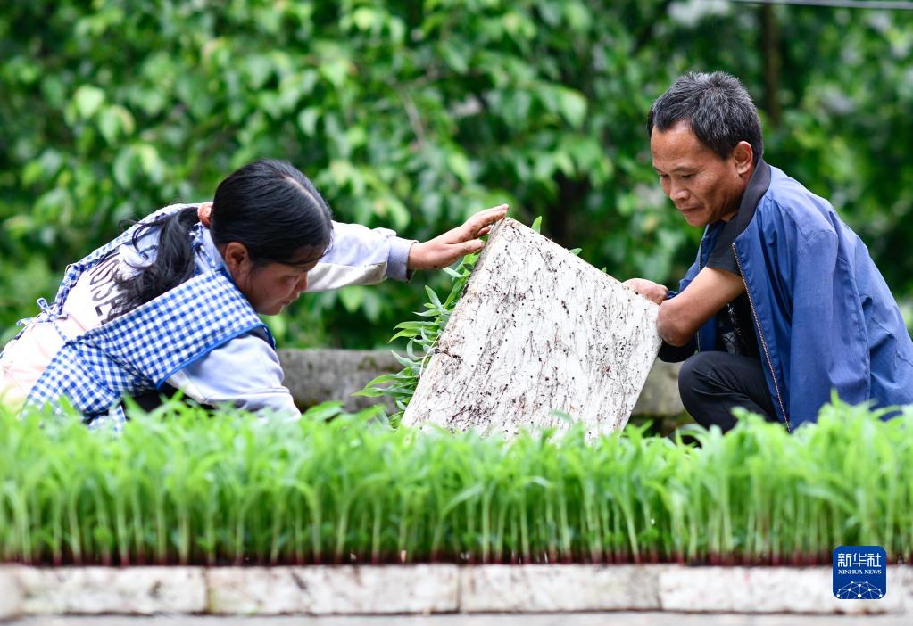 趙友良與妻子簡琴清理準備移栽的玉米苗(5月12日攝)。