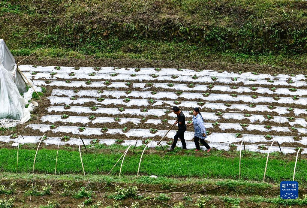 趙友良與雙目失明的妻子簡琴走在下地干活的途中(5月12日攝)。
