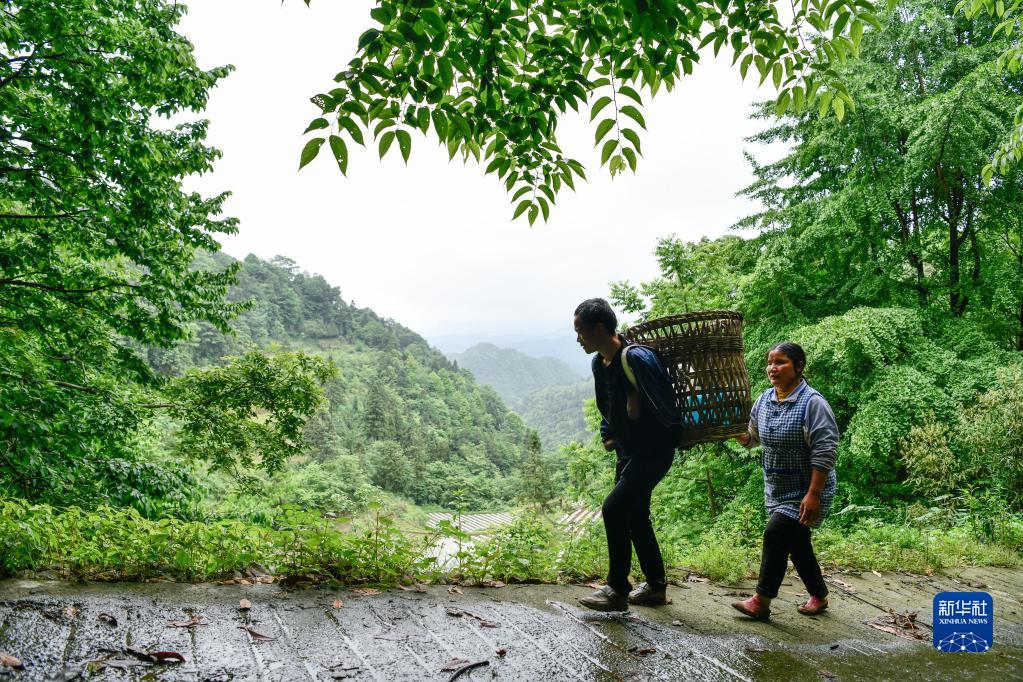 趙友良背著背簍,牽引著雙目失明的妻子簡琴下地干活(5月12日攝)。