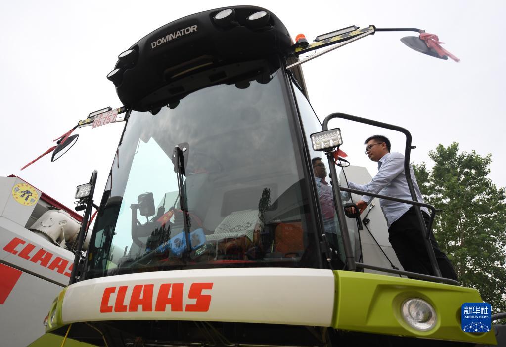 5月25日,在位于河南省鄧州市的公司農(nóng)機(jī)設(shè)備停放處,沈興新登上收割機(jī)查看設(shè)備狀態(tài)。
