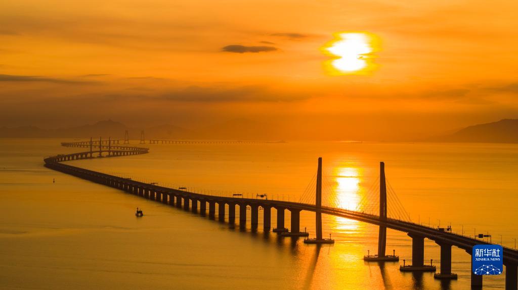 港珠澳大橋海上日出(2019年8月7日攝,無人機照片)。港珠澳大橋橫跨珠江口伶仃洋海域,全長約55公里,集橋、島、隧于一體,是世界最長的跨海大橋。